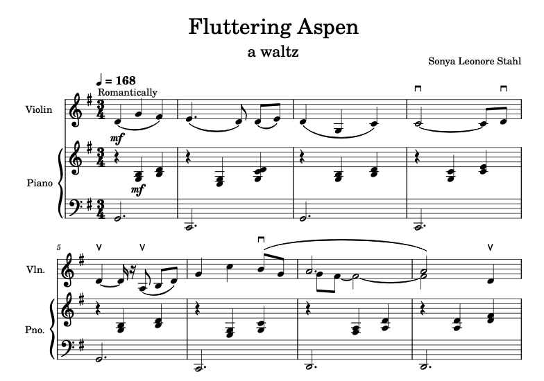 Fluttering Aspen is a waltz written for violin and piano, inspired by the aspen trees composer Sonya Leonore Stahl saw dancing with the breeze and "fluttering their eyelashes on the cheek of the wind." The unique flapping of aspen leaves, like the wings of a thousand butterflies, is caused by the unusually flat shape of the petiole of the aspen leaf, hence the back and forth motion instead of twisting in any direction.