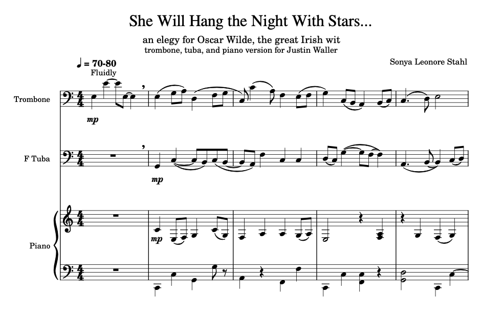 Taken from the lines "She will hang the night with stars so that I may walk abroad in the darkness without stumbling" written by Oscar Wilde, this hymnlike elegy honors his creativity and connection to beauty. The piece was originally written for string orchestra in 1999, but composer Sonya Leonore Stahl created this version for tenor trombone and F tuba with piano accompaniment in 2022 for Justin Waller. Also available is a 2018 band transcription by Nikk Pilato: https://nikkpilato.net/she-will-hang-the-night-with-stars.html
